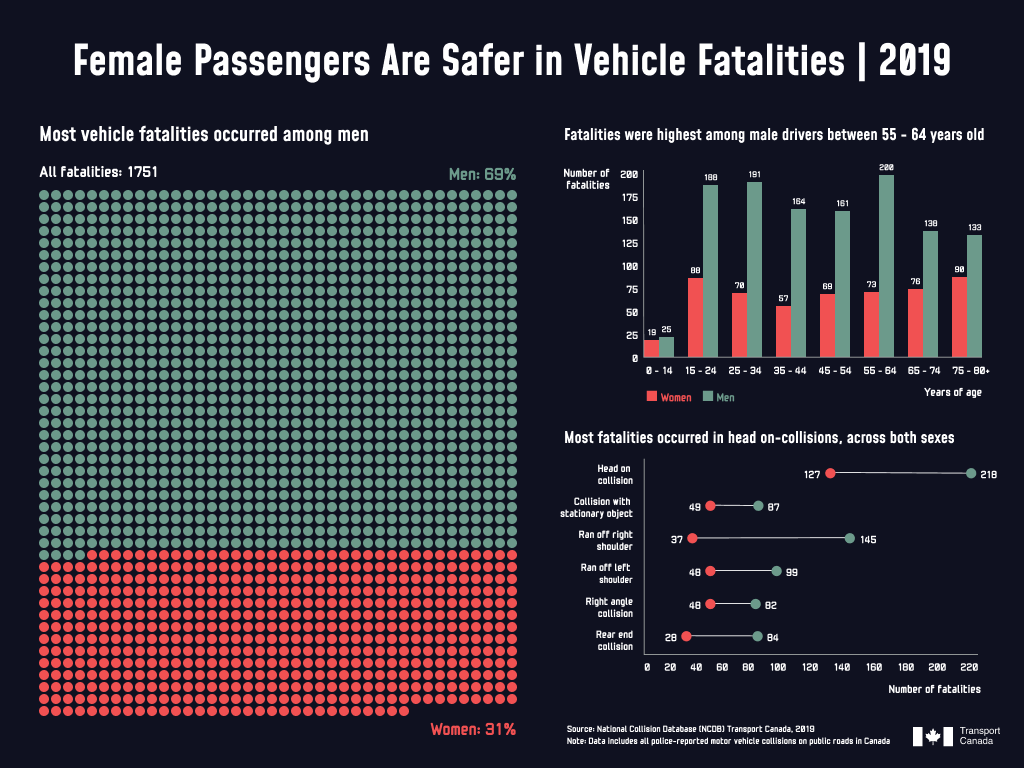 Re-designing an overwhelming and cluttered data visualization from Statistics Canada on passenger vehicle fatalities to illustrate the difference between male and female fatalities, using data from National Collision Database (NCDB) from Transport Canada in 2019.