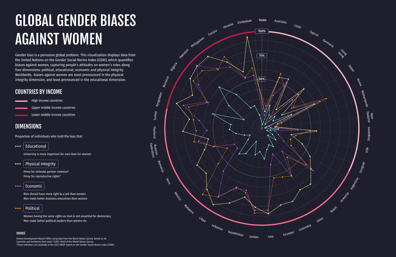 Visualizing data from the UNDP’s Gender Social Norms Index (2017-2022), which captures people’s attitudes on women’s roles along four key dimensions: political, educational, economic and physical integrity.